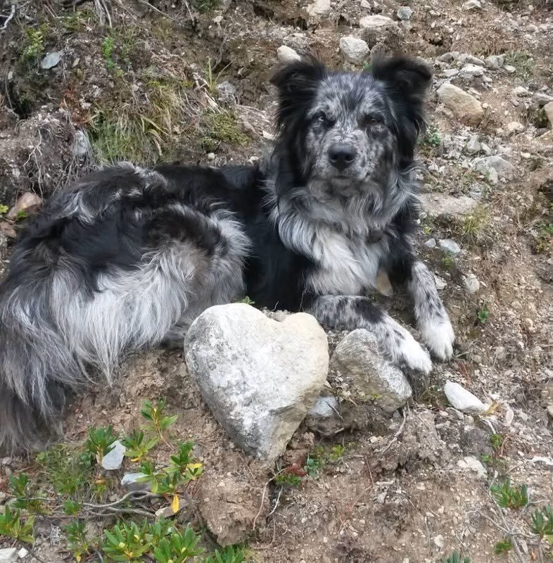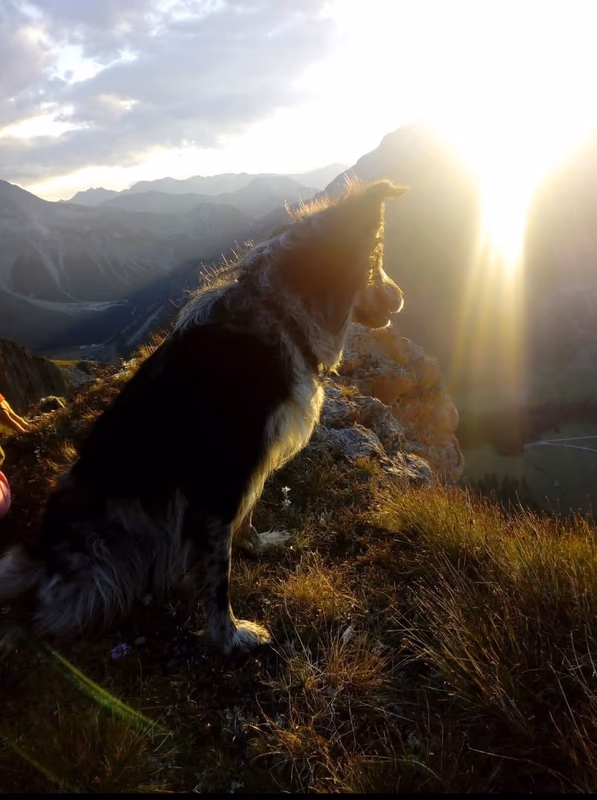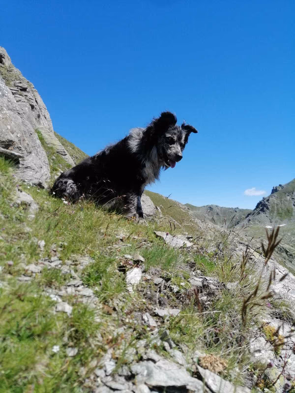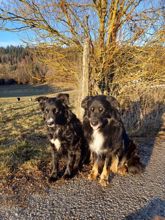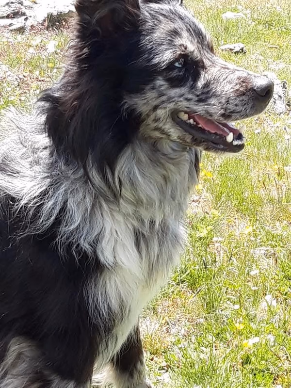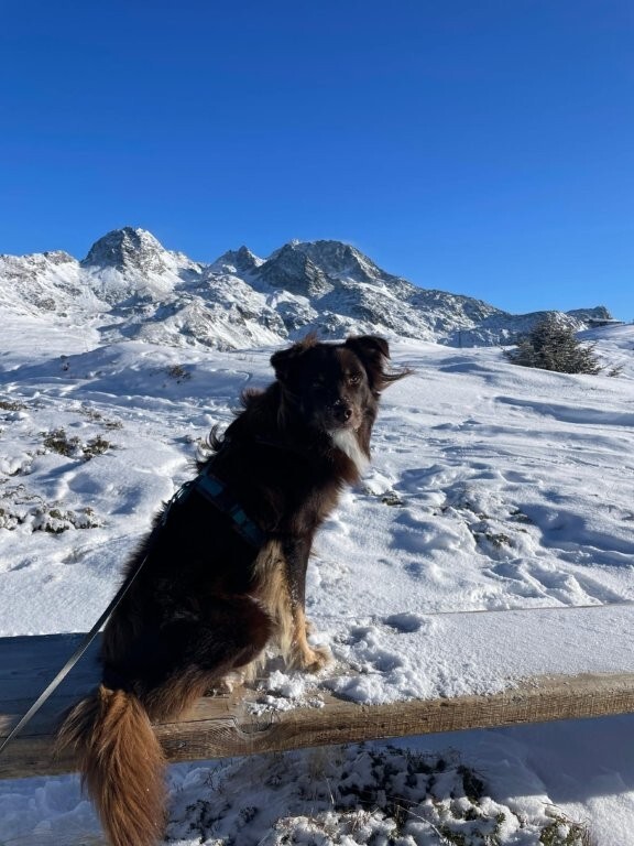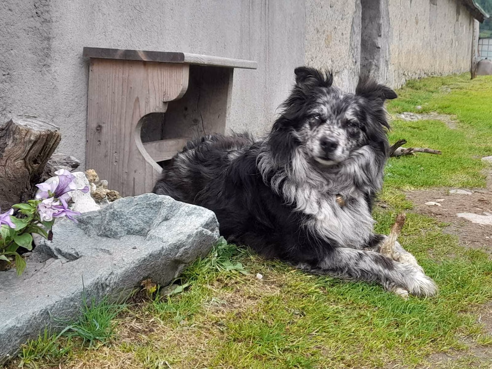 Joy stammt aus unserem allerersten Wurf mit Anny und Joker und hat sich am 30 Juli 2025 im Alter von 11 Jahren auf ihre letzte Reise gemacht. Ihre erste Reise hat sie mit mir im Alter Alter von 10 Wochen in die Schweizer Berge gemacht. Als wäre es gestern gewesen, kann ich mich noch so gut daran erinnern. Ihr Besitzer Rene hatte damals auf einer Alm in Samnaun gearbeitet und ich habe sie zu ihm gebracht. Ein kurviger, einsamer Schotterweg in naturbelassener Umgebung und am Ende kamen wir an einem Hof an, in dem gerade die Kühe gemolken wurden. Für mich war dies eine unbeschreiblich schöne Erfahrung und ich wusste, Joy hat in den Bergen unter den Kühen ihr perfektes Zuhause gefunden. Jeden Sommer verbrachte sie auf der Alp und wurde zu einer unentbehrlichen Arbeitskraft.